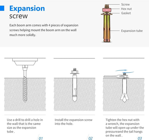Install each boom arm on a load-bearing wall using the included expansion anchors or suitable alternatives for secure mounting.