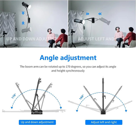 This 2-pack is ideal for professional photographers, videographers, studio managers, and content creators who need multiple mounting points for expansive or complex lighting arrangements. Perfect for small studios, home setups, or large production spaces, these boom arms support equipment such as monolights, LED video lights, and grip gear, ensuring a clutter-free environment and enhanced workflow efficiency for multi-light setups.