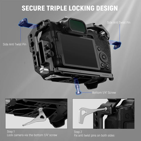 With a secure fit guaranteed by a 1/4" mounting screw and two anti-twist pins that lock into the strap eyelets, the CA039 stays firmly in place. The rubberised base adds extra grip and prevents scratches during handheld shooting or transport. This cage is ideal for photographers and videographers seeking a sturdy platform for mounting a variety of accessories without compromising the camera’s usability or portability.