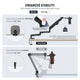 The MS002 overcomes these challenges with its pneumatic balancing system that prevents drift and vibration, keeping your microphone exactly where you set it during long sessions. Its internal cable management channel hides cables neatly, creating a tidy and professional workspace. The arm offers an extended horizontal reach of 76.8cm, 360-degree rotation at both the base and mic mount, and adjustable damping at each joint so you can customise movement tension for your needs.