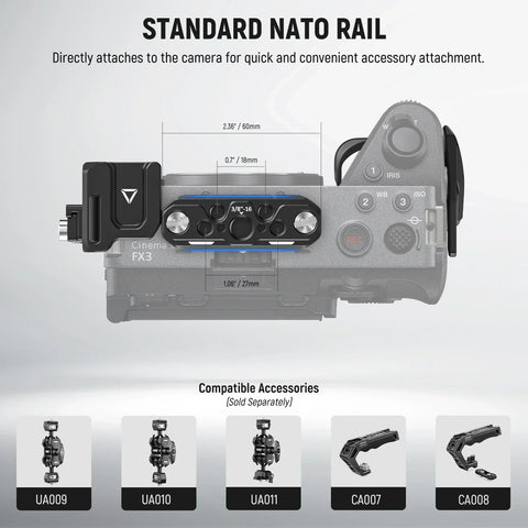 Tailored for Sony FX30 and FX3 cameras, the CA011 Camera Cage offers modular versatility for videographers and filmmakers seeking accessory expansion and camera protection. This cage includes a NATO rail for swift accessory attachment and an HDMI cable clamp to ensure secure cable placement. Designed with convenience in mind, a magnetic screwdriver housed beneath the cage simplifies screw fastening. Post-removal of the top NATO rail, this cage remains compatible with the original XLR handle.