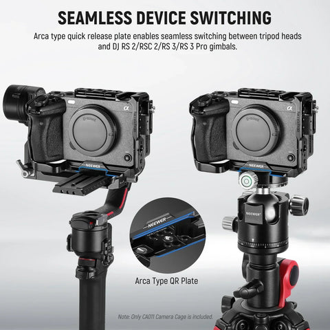 Built with a standard Arca type base, this camera cage seamlessly mounts onto tripods or video heads with identical mounting systems, ensuring effortless transitions between setups. Compatible with DJI RS 2, RSC 2, RS 3, and RS 3 Pro stabilizers, the CA011 facilitates smooth and cinematic video recording experiences. Its ergonomic construction, processed with CNC precision machining, guarantees full accessibility to camera buttons, ports, and the battery compartment while maintaining lightweight portability, weighing just 161g. Crafted from anodized aluminum alloy, this cage is resistant to corrosion, scratches, and impacts, providing ultimate stability to prevent shaky footage.