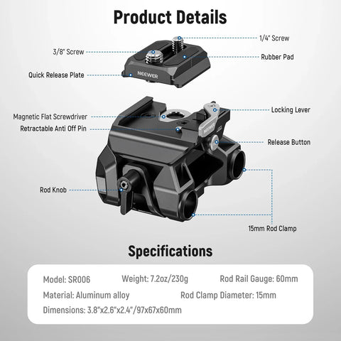Crafted from robust aluminium alloy, the Neewer SR006 offers durability while maintaining a lightweight design. Its triple security features, including anti-drop mechanisms and retractable pins, ensure your gear stays securely in place, whether you're filming in a studio or on the move. With dual 15mm rod clamps, it's compatible with a wide range of accessories, making it a versatile addition to your kit.